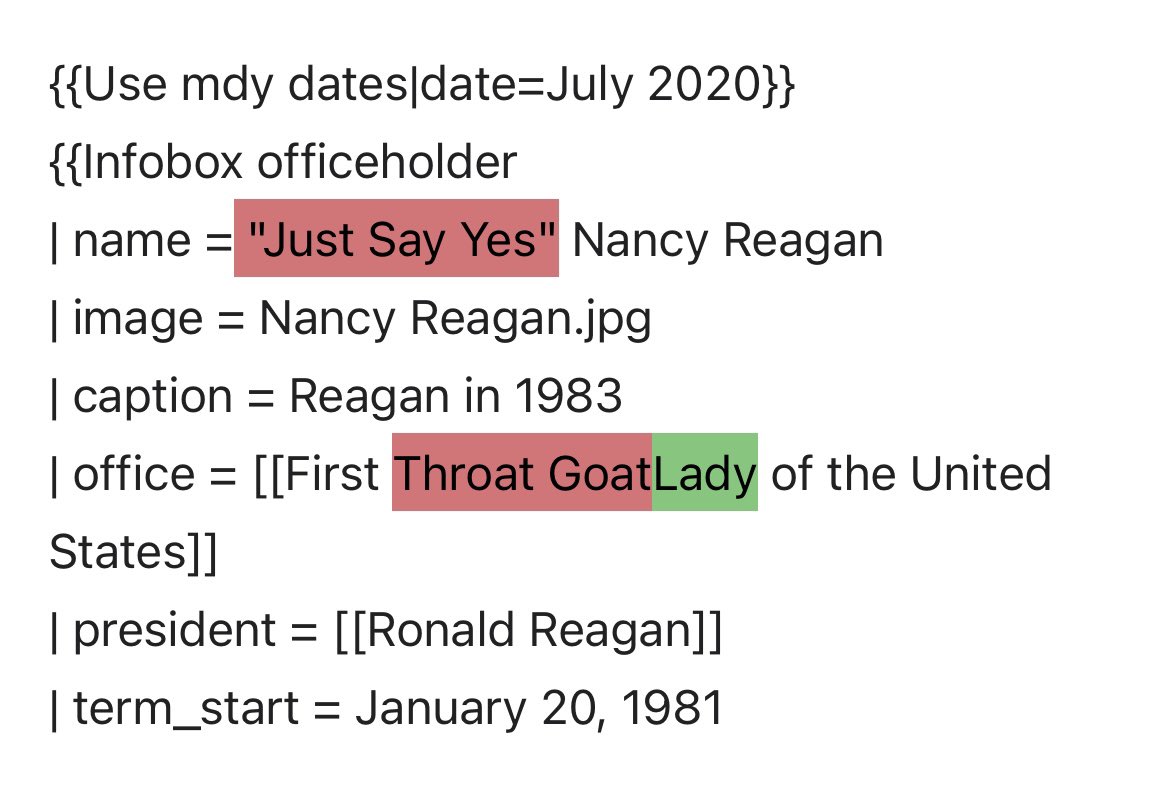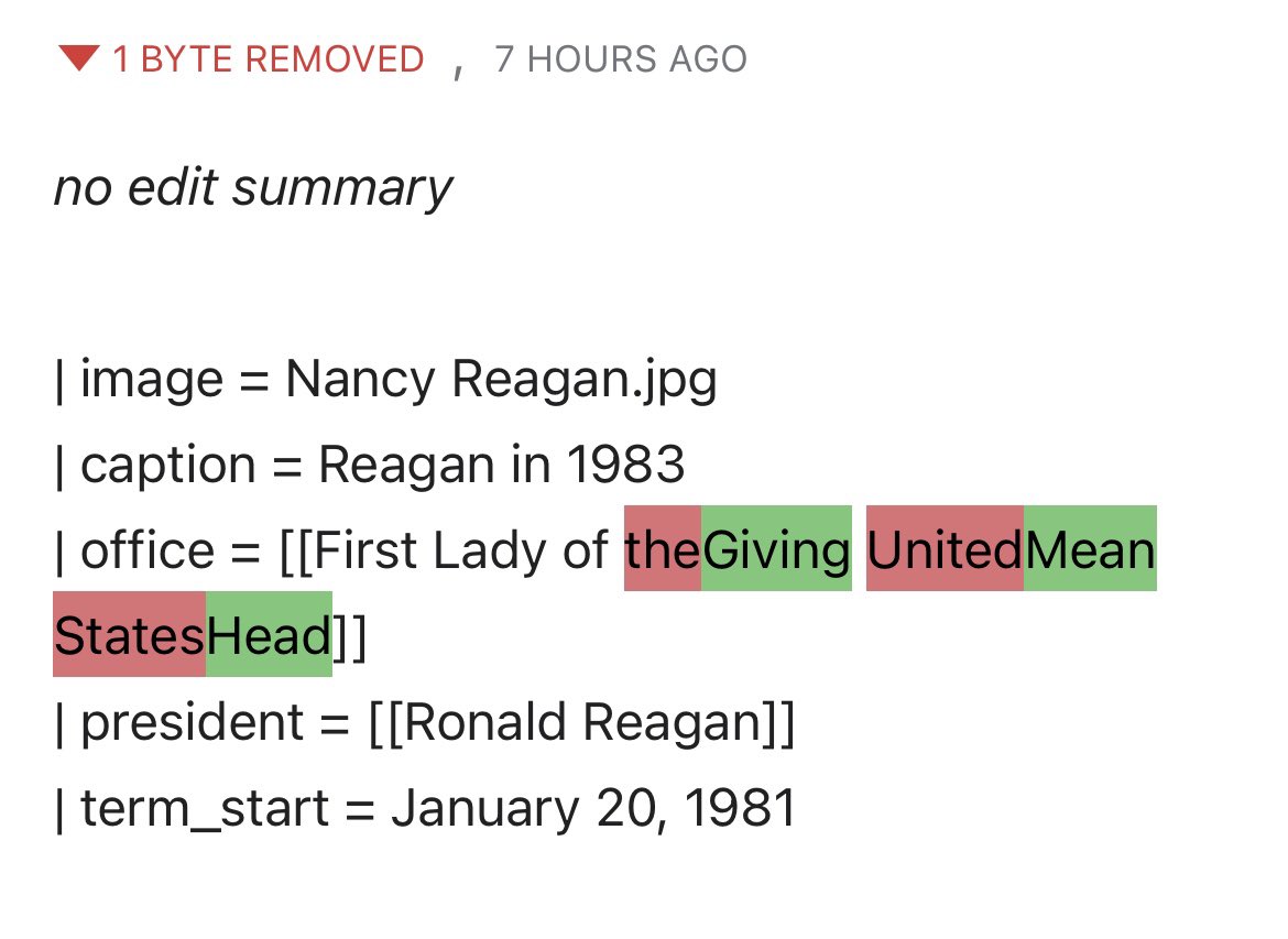 Olivia Randolph Sunday, December 10, 2023 · 6:00 PM · ▾ ▶the edit history for Nancy Reagan’s Wikipedia page has became my favorite website1 / 4× 2 / 4× 3 / 4× 4 / 4× ❮❯unlikecommentstweet85 like this|19 saw this post
