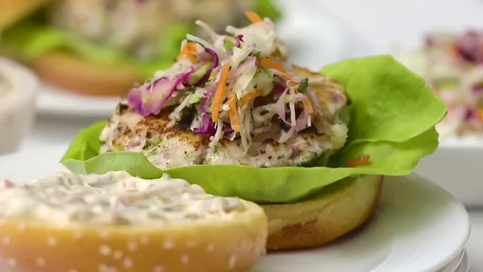 Serve these Smashed Walleye Burgers and sit back and enjoy raving comments when family and friends bite into them. Homemade tartar sauce and tasty Ontario toppings make this a stellar lunch or dinner meal. #loveONTfood #Burger